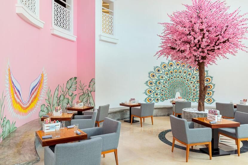 Each wall in the establishment is decorated with unique murals that make a great backdrop for photos. Outside, you'll find shaded seating areas perfect for larger groups and families. They're surrounded by tall trees with lanterns that light up after sunrise.